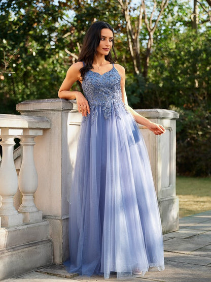 A-Line/Princess Tulle Applique V-neck Sleeveless Floor-Length Dresses