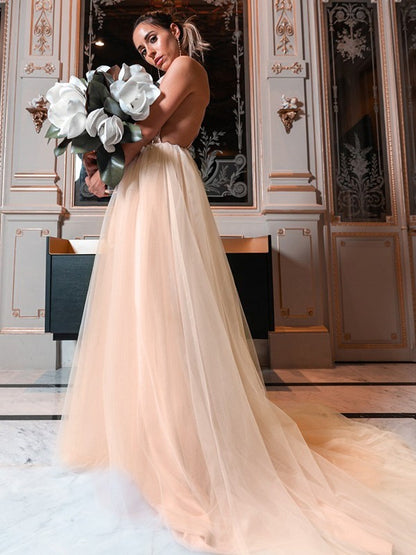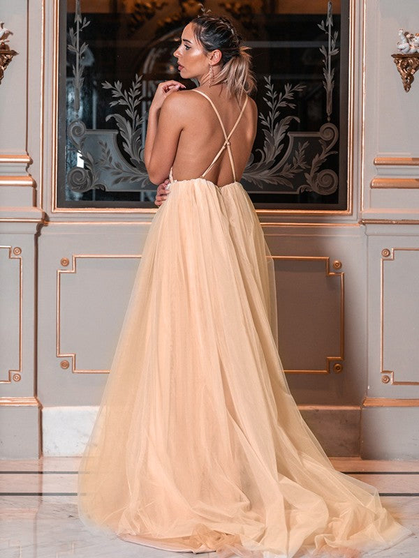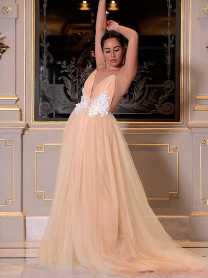 A-Line/Princess Tulle Applique V-neck Sleeveless Sweep/Brush Train Dresses