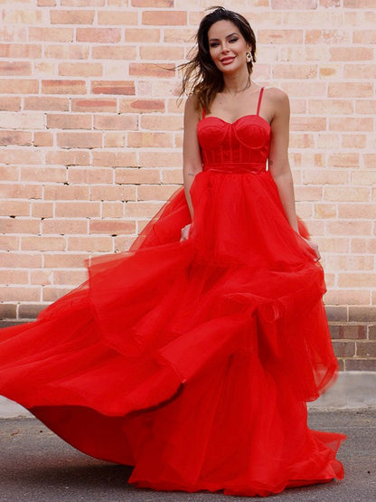A-Line/Princess Tulle Layers Spaghetti Straps Sleeveless Sweep/Brush Train Dresses