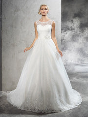 Ball Gown Sheer Neck Sash/Ribbon/Belt Sleeveless Long Net Wedding Dresses