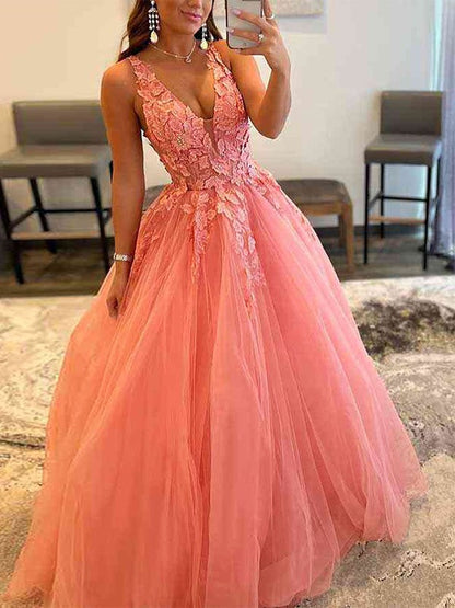 Ball Gown Tulle Applique V-neck Sleeveless Floor-Length Dresses