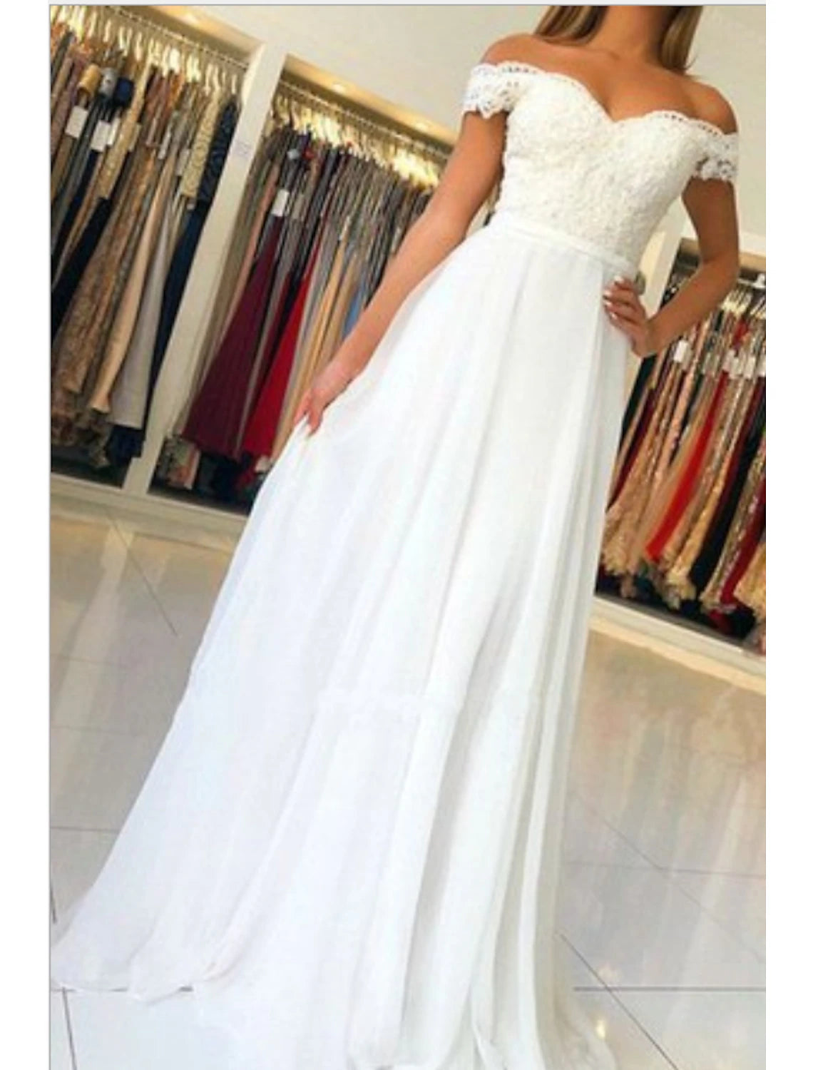 Beach Wedding Dresses A-Line Off Shoulder Cap Sleeve Sweep / Brush Train Chiffon Bridal Gowns With Pleats Appliques