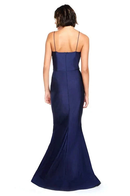 This elegant evening gown features a hooded collar and off-shoulder design, complemented by delicate thin straps. Its backless style and floor-length silhouette create a stunning, sophisticated look perfect for any formal occasion.