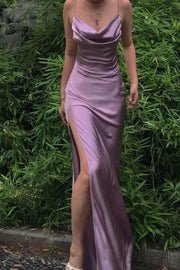 Lustrous Satin Prom Dresses with Cowl Neckline, Spaghetti Straps, Daring High Slit and Form-Fitting Maxi Silhouette Formal Gown