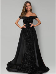 Mermaid / Trumpet Evening Gown Sparkle & Shine Dress Formal Black Dress Plus Size Sweep / Brush Train Sleeveless Off Shoulder Tulle with Sequin - US 16 / UK 20 / EU 46