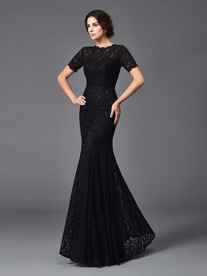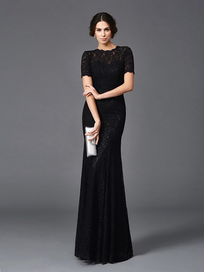 Sheath/Column Jewel Lace Short Sleeves Long Woven Satin Mother of the Bride Dresses