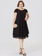 Sheath / Column Mother of the Bride Dress Formal Little Black Dress Plus Size See Through Jewel Neck Knee Length Chiffon Lace Short Sleeve No with Pleats Beading Lace Insert - US 2 / UK 6 / EU 32