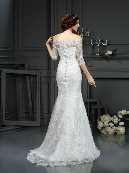 Sheath/Column Off-the-Shoulder Lace 1/2 Sleeves Long Lace Wedding Dresses