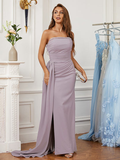 Sheath/Column Stretch Crepe Ruched Strapless Sleeveless Sweep/Brush Train Dresses