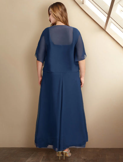 Two Piece A-Line Mother of the Bride Dresses Plus Size Hide Belly Curve Elegant Dress Formal Asymmetrical Half Sleeve Square Neck Chiffon with Pleats Appliques