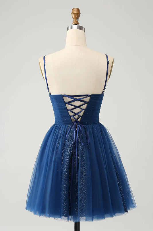 Sparkling navy blue A-line thin shoulder strap pleated sheer short sequined back to school dress