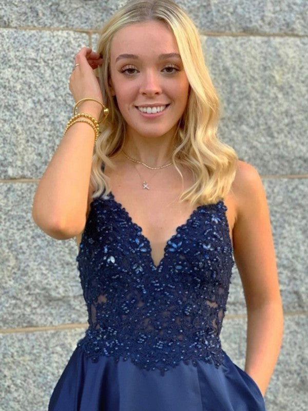 A-Line/Princess Woven Satin Applique V-neck Sleeveless Sweep/Brush Train Dresses