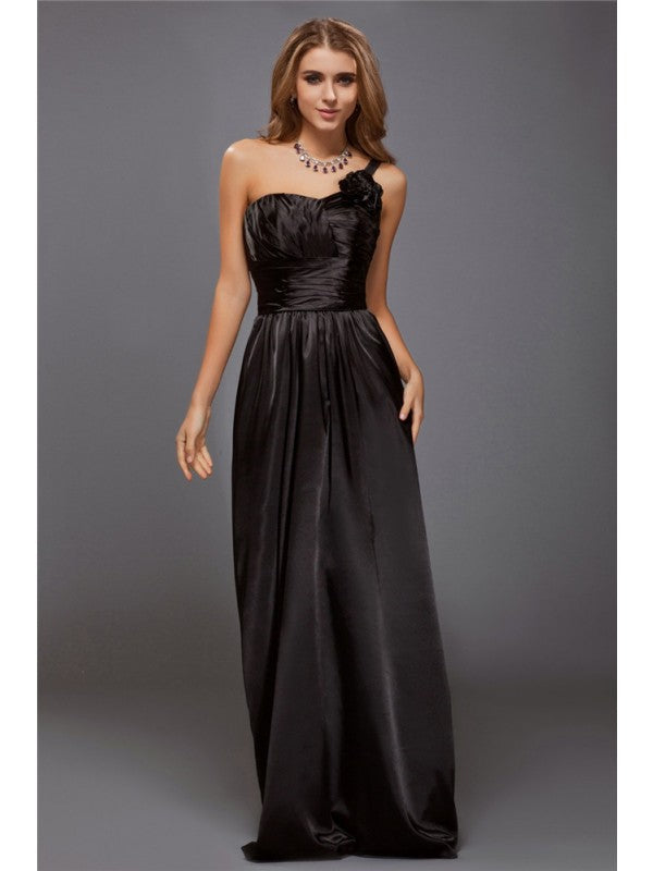 Sheath/Column One-Shoulder Sleeveless Ruffles Long Satin Bridesmaid Dresses